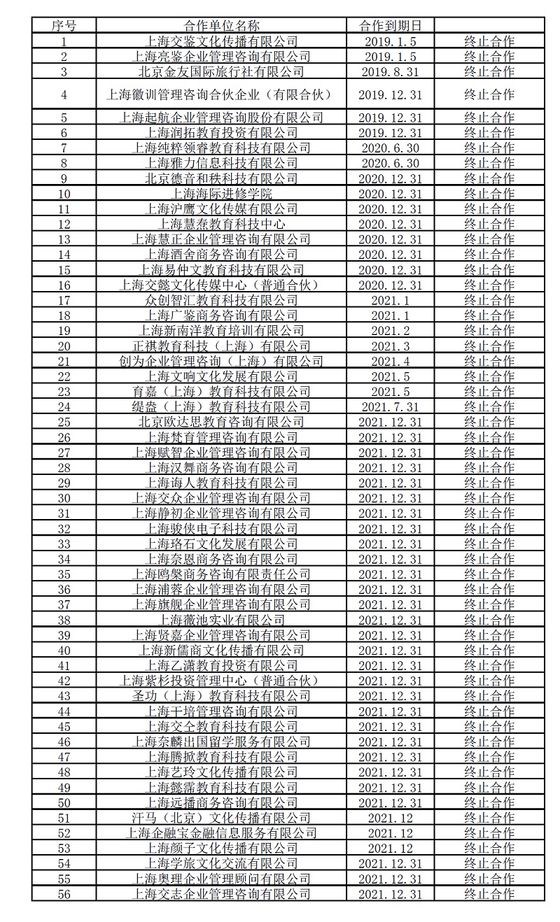 因国家和学校政策调整,sjb世俱杯中国官网入口(由原sjb世俱杯中国官网入口继续教育学院与原sjb世俱杯中国官网入口海外教育学院合并后成立)与附表所列公司合作协议到期,合作终止,不再续约,合作关系自然终止;或经友好协商后,一致协商同意终止合作关系。