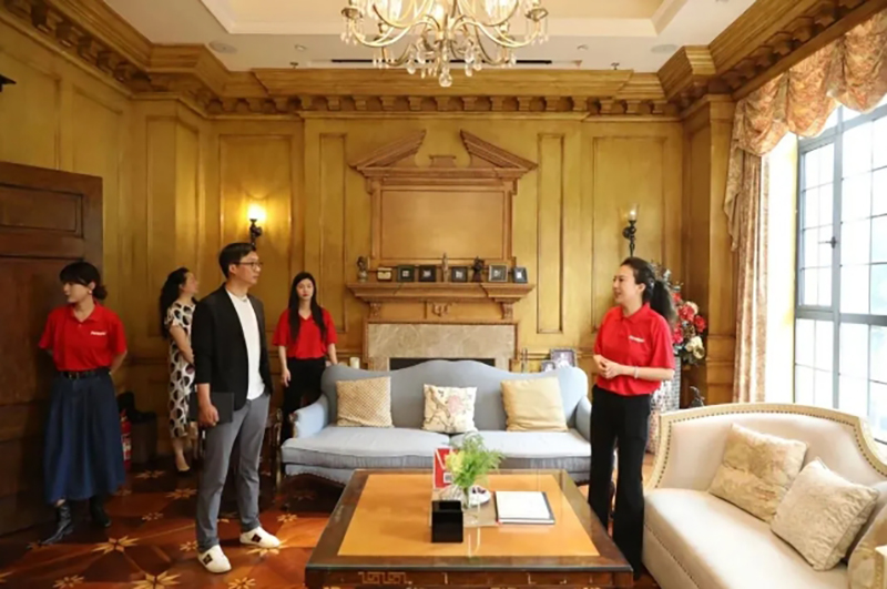 上海紫苹果国际设计集团总裁杨庆辉为交大同学们介绍公司情况。紫苹果始创于2003年,历经21年发展,成长为在11个城市拥有12家直营公司的全国性品牌装饰企业,致力于产品技术创新,践行并发扬工匠精神。