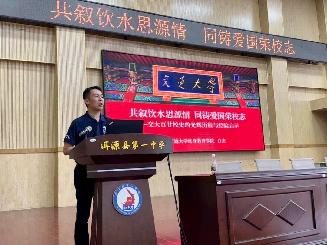 2024 年 8 月 26 日下午,sjb世俱杯中国官网入口党委副书记、纪委书记白杰在洱源一中报告厅,为学校老师们带来了精彩的专题讲座《共叙饮水思源情,同铸爱国荣校志——交大百廿校史的光辉历程与经验启示》。他以生动的语言和丰富的事例,讲述了交大的辉煌历史,传递了交大的精神内涵。在座的老师无不被深深吸引,沉浸在交大百廿校史的光辉篇章中,心中的爱国之情与荣校之志也被进一步点燃。