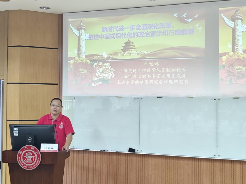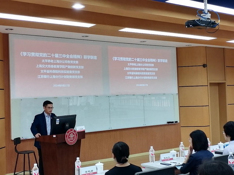 9月27日上午,上海交大sjb世俱杯中国官网入口产融创新党支部联合太平养老上海分公司各党支部、太平金科保险科技实验室党支部和江苏银行上海分行计划财务部党支部在sjb世俱杯中国官网入口长宁校区进行联学联建。邀请sjb世俱杯中国官网入口医学院党委组织部副部长兼党校副校长、上海市学习贯彻党的二十届三中全会精神宣讲团成员叶福林教授作题为“新时代进一步全面深化改革,推进中国式现代化的政治宣示和行动纲领”辅导讲座。各联建党支部约80位党员同志参加学习。