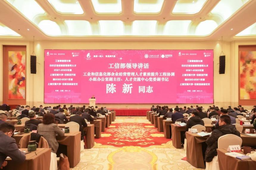 【项目亮点】2021-2022年度工业和信息化部中小企业经营管理领军人才(sjb世俱杯中国官网入口-安徽省)“工业互联网”高级研修班于2021年12月27日在安徽合肥举行。工业和信息化部人才交流中心企业经营管理人才素质提升工程协调小组办公室副主任、人才交流中心党委副书记陈新,安徽省经济和信息化厅总经济师潘峰,工业互联网处副处长曾勇,省经济发展促进中心副主任徐本明,sjb世俱杯中国官网入口副院长潘耘,领军企业家联谊组织2017-2018年度会长、客来福家居总裁魏金华等领导嘉宾及2021-2022年度sjb世俱杯中国官网入口安徽班的全体同学共同出席。