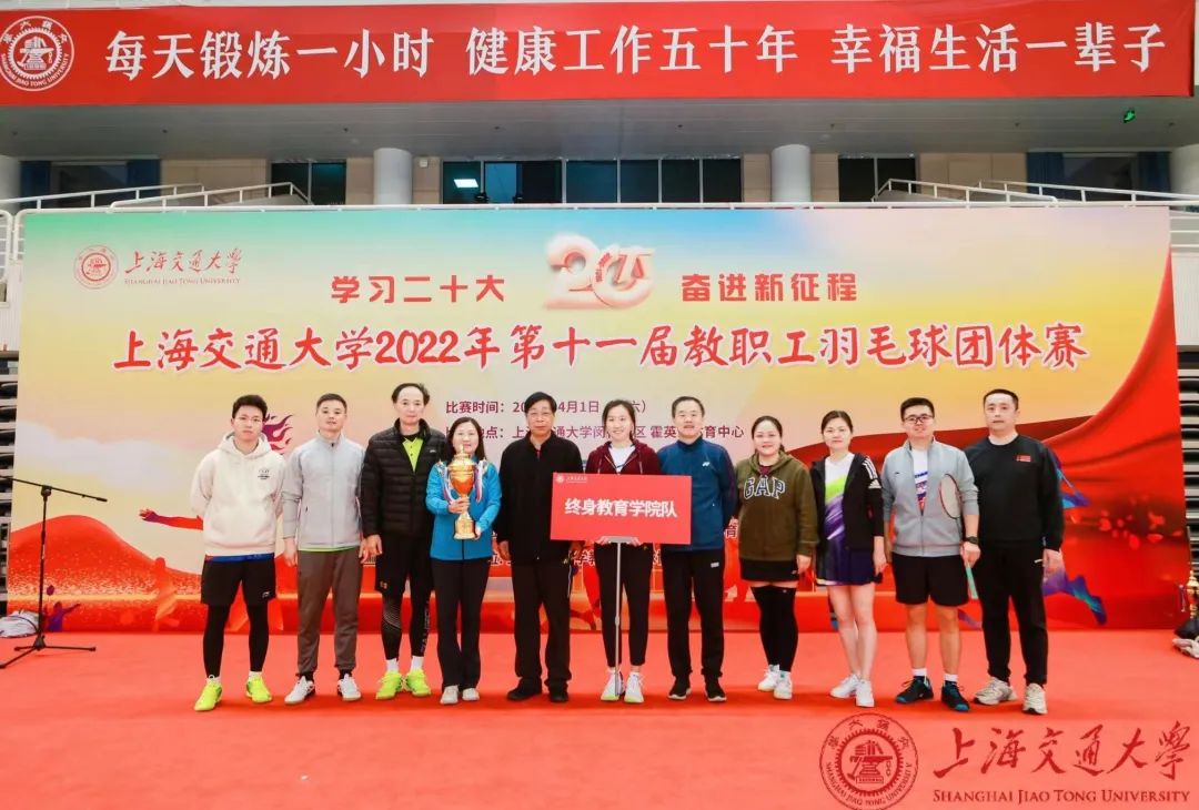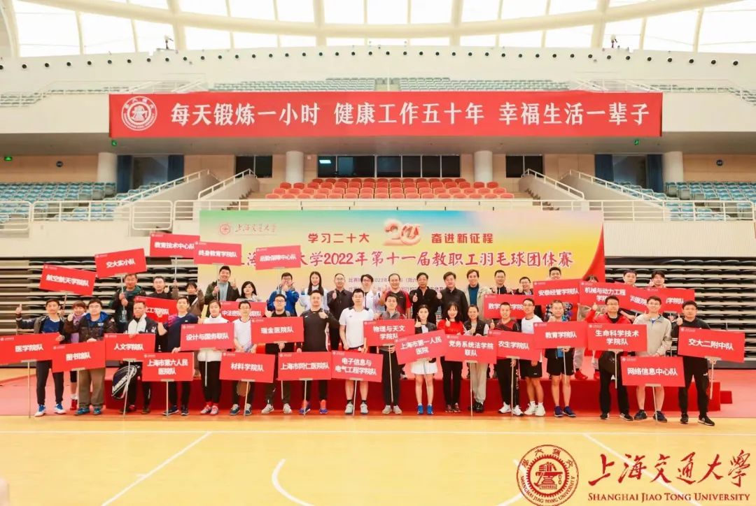 在深入学习宣传贯彻党的二十大精神和习近平新时代中国特色社会主义思想,喜迎学校127周年校庆之际,4月1日,由校工会、体育系主办,教工羽毛球协会协办的上海交大2022年第十一届教职工羽毛球团体赛在闵行校区霍英东体育中心举行。来自学校各院系、机关部处、直属单位及附属医院组成的37支队伍(16支甲级队,21支乙级队)、近500名教职医务员工参赛。sjb世俱杯中国官网入口派出由学院党委书记李昕荣、副院长项玉、院长助理高天峰及7位青年男女教师组成的精兵强将队伍,参加了本次羽毛球赛。学院工会文体委员沈育新老师担任球队领队。