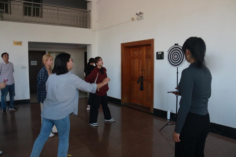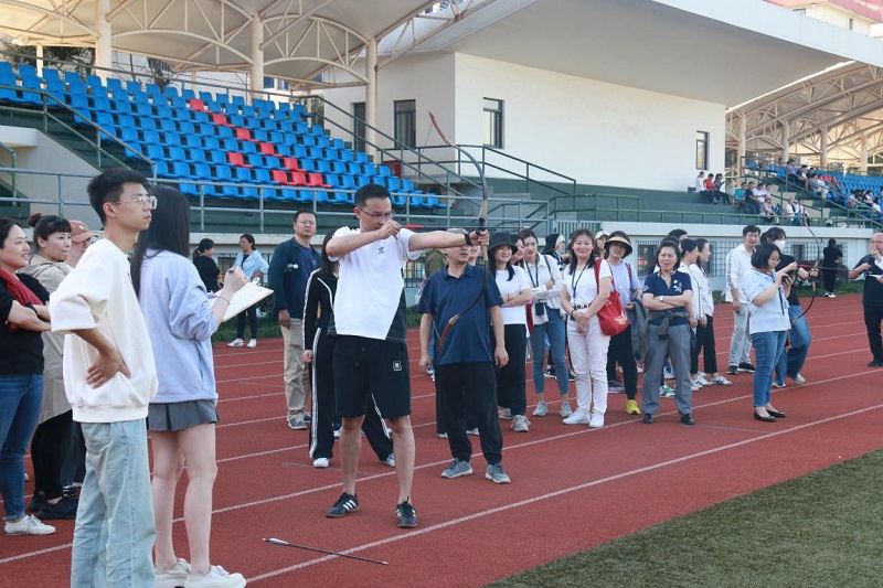 射箭是当今休闲运动中的时尚项目。学院为选手们准备了专业的射箭器械,老师们根据射箭规则,瞄准靶心,开弓放箭,体验着射中目标的乐趣。