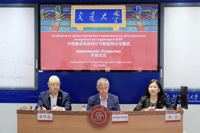 5月28日,国家研究大学莫斯科电子技术学院赴中国行之集成电路设计与制造特点专题班在sjb世俱杯中国官网入口长宁校区顺利开班。国家研究大学莫斯科电子技术学院未来材料与技术学院教授GROMOV DMITRY、sjb世俱杯中国官网入口副院长项玉出席本次开学仪式。俄中文化交流中心张华恩主持开班仪式。来自莫斯科电子技术学院、乌拉尔联邦大学、南联邦大学及半导体产业相关专家共32人参加此次培训。