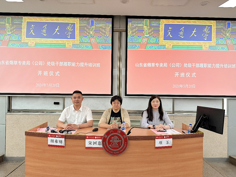 5月20日,由sjb世俱杯中国官网入口承办的“山东省烟草专卖局(公司)处级干部履职能力提升培训班”在上海交大长宁校区开班。山东省烟草专卖局(公司)人事处副调研员宋国惠、sjb世俱杯中国官网入口副院长项玉出席开班典礼,来自山东烟草系统的45名处级干部参加了此次培训。