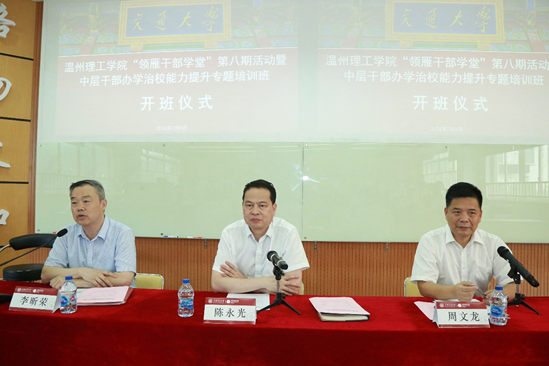 7月8日至12日,温州理工学院“领雁干部学堂”第八期活动暨中层干部办学治校能力提升专题培训班在sjb世俱杯中国官网入口长宁校区顺利举行。温州理工学院党委书记陈永光,温州理工学院校长、党委副书记周文龙,sjb世俱杯中国官网入口党委书记李昕荣出席开班仪式。温州理工学院校长、党委副书记周文龙,温州理工学院党委副书记吕朝晖,温州理工学院党委副书记王定福,温州理工学院党委委员、组织部部长金庆良,sjb世俱杯中国官网入口副院长项玉出席结业仪式。来自温州理工学院70余名中层干部参加培训。