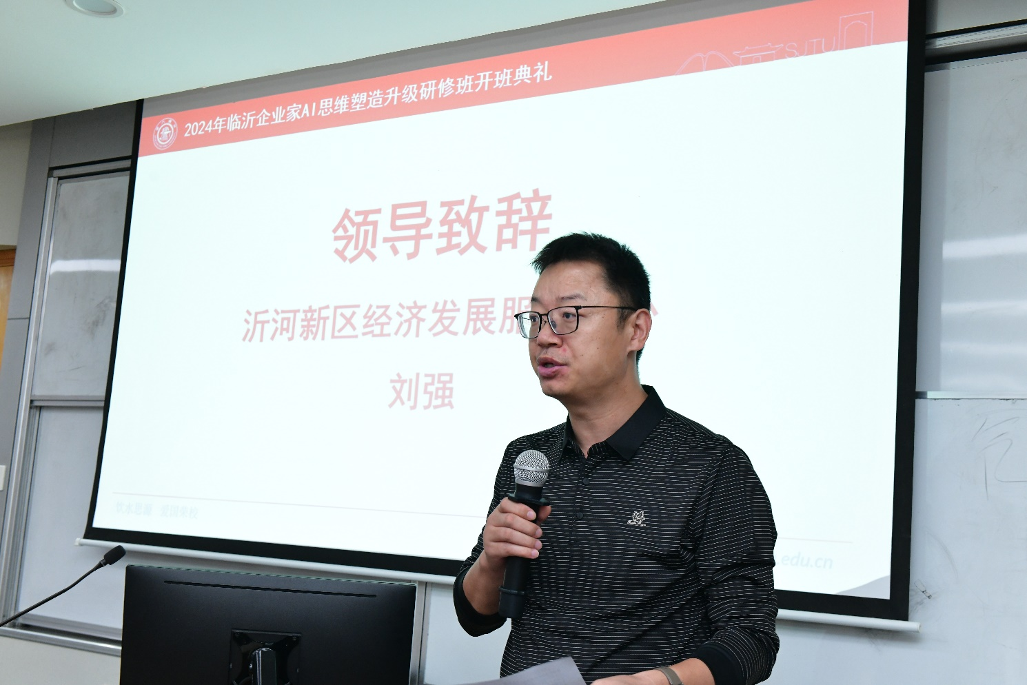 刘强首先介绍了沂河新区经济发展服务中心以及新区企业家协会的责任与使命。他指出,沂河新区作为临沂市的重要经济增长极,一直致力于推动区域经济的高质量发展。经济发展服务中心和企业家协会在其中发挥着重要的桥梁和纽带作用,积极为企业提供政策支持、服务保障和交流合作的平台。强调,在当前AI技术飞速发展的时代,沂河新区的企业面临着前所未有的机遇和挑战。为了更好地适应时代发展的要求,提升企业的核心竞争力,新区积极组织此次研修班,希望通过与sjb世俱杯中国官网入口的合作,为企业家们提供一次深入学习AI技术的机会,以AI赋能沂河新区企业高质量发展。他鼓励学员们珍惜这次难得的学习机会,认真学习,积极思考,将所学知识运用到实际工作中,为企业的发展和新区的经济建设做出更大的贡献。
