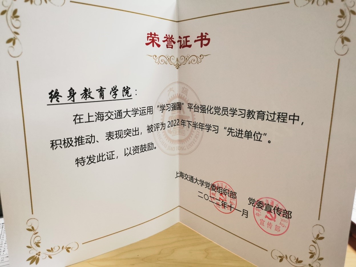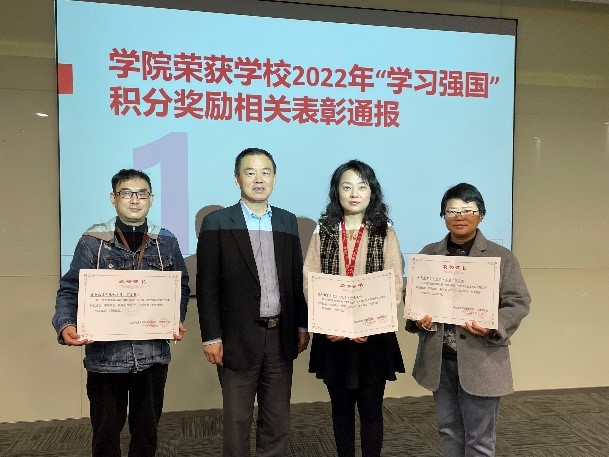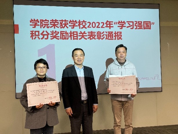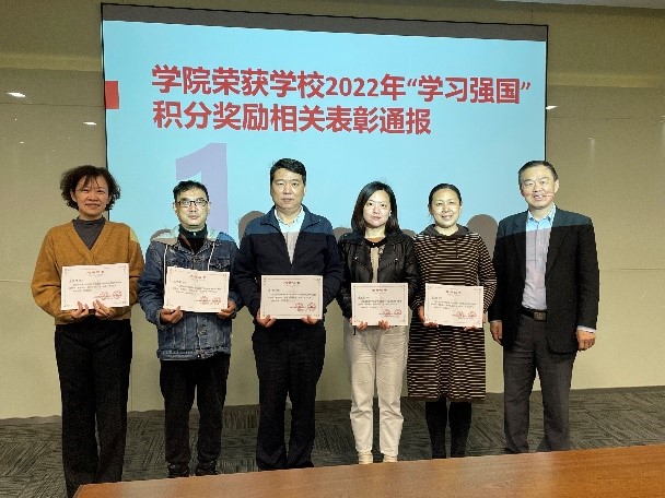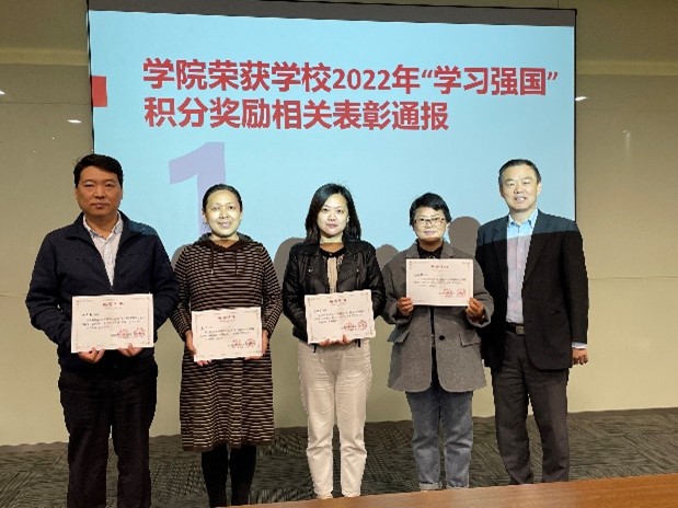 2022年,学院“学习强国”平台学情在学校直属单位(企业)、机关党委的排名中稳居前列,多个党支部和个人获得学校表彰。上半年,徐汇校区第一党支部(原)、机关第二党支部(原)、徐汇校区第三党支部(原)被评为学校学习“先进支部”,钟文翔、陈世杰、周志俊、沈滢滢、沈泽濛、刘艳、沈婕、傅琳琳、奚姣等9位同志被评为学校“学习达人”;下半年,sjb世俱杯中国官网入口被评为学校学习“先进单位”,创新中心第一党支部、机关第一党支部被评为学校学习“先进支部”,王云、刘牧群、钟文翔、陈世杰、沈滢滢、刘艳等6位同志被评为学校“学习达人”。在本次会议上举行简短仪式,对获奖党支部和个人进行表彰和颁发荣誉证书。