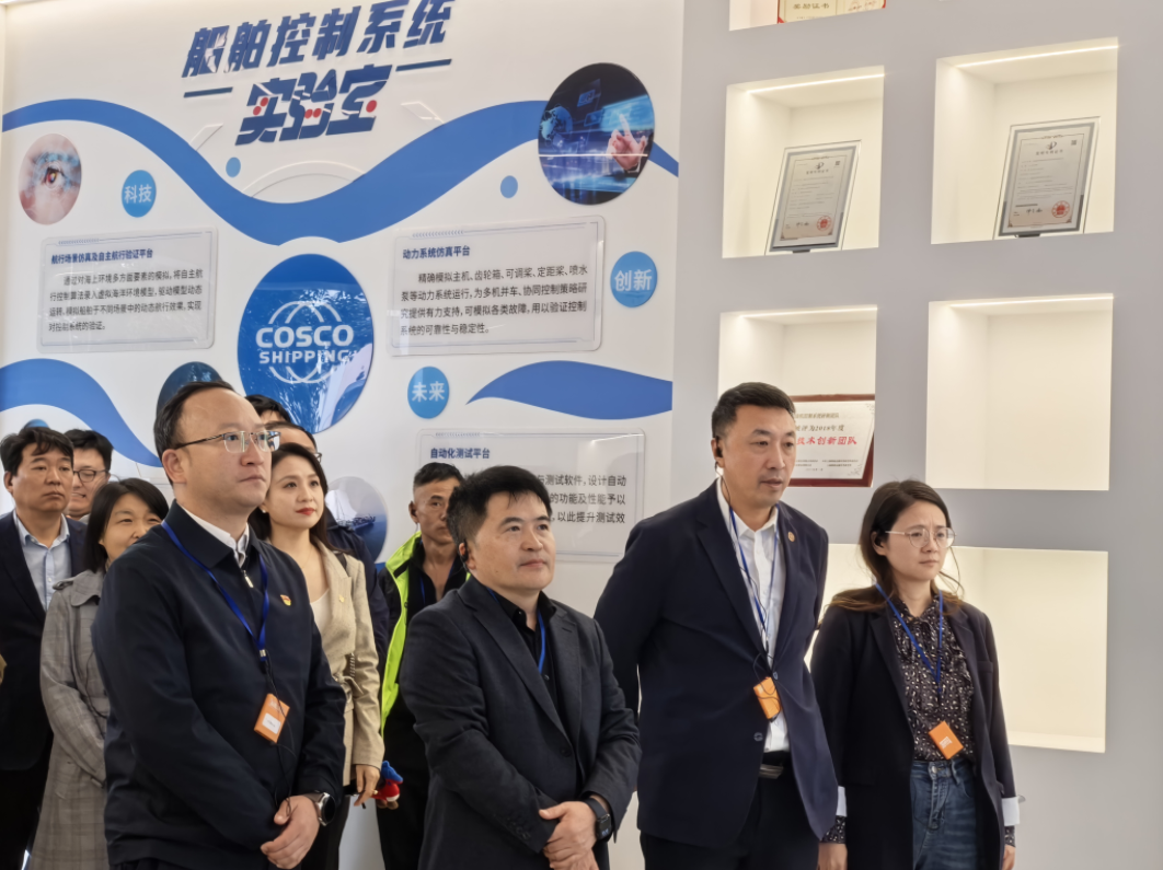 交流团一行先后参观了船舶控制实验室、MASS(大规模自主船舶系统)实验室和企业文化展厅,深入了解船舶自主航行、智能路径规划与跟踪、障碍物精准避碰等面向未来的智慧航运先进技术,深入领会一代代“中远重工人”如何秉持着专注执着、精益求精、勇于创新的工匠精神,让中远海运从筚路蓝缕到跻身行业前列的奋斗足迹。