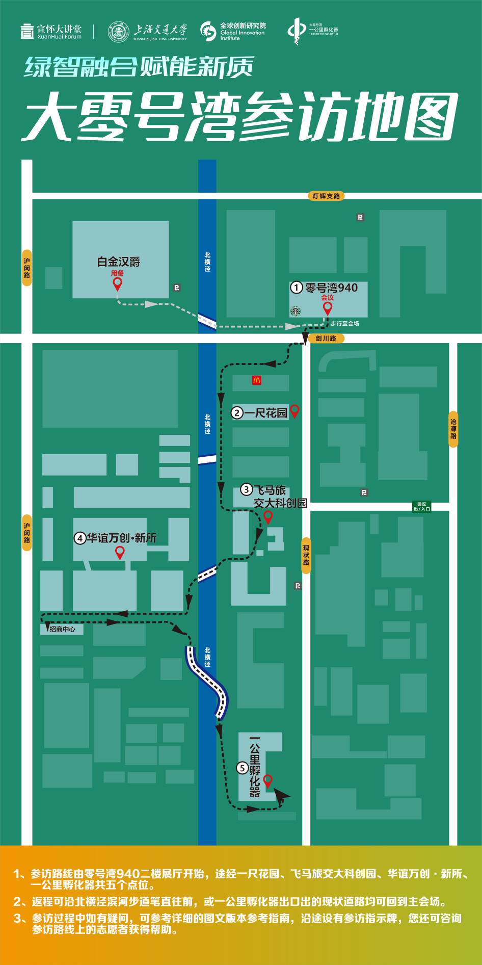 -(3)飞马旅交大科创园-(4)华谊万创·新所-(5)一公里孵化器五个地点,参访地图如下: