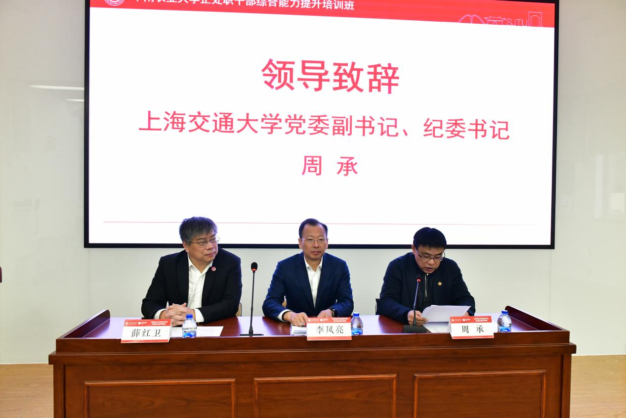 1月13日上午,华南农业大学正处职干部综合能力提升培训班在sjb世俱杯中国官网入口长宁校区开班。华南农业大学党委书记李凤亮,党委副书记、校长薛红卫,党委副书记丁红星,sjb世俱杯中国官网入口党委副书记、纪委书记周承,sjb世俱杯中国官网入口党委书记李昕荣、院长胡洁、副院长陈猛出席仪式。47名华南农业大学正处职干部参加本次培训。