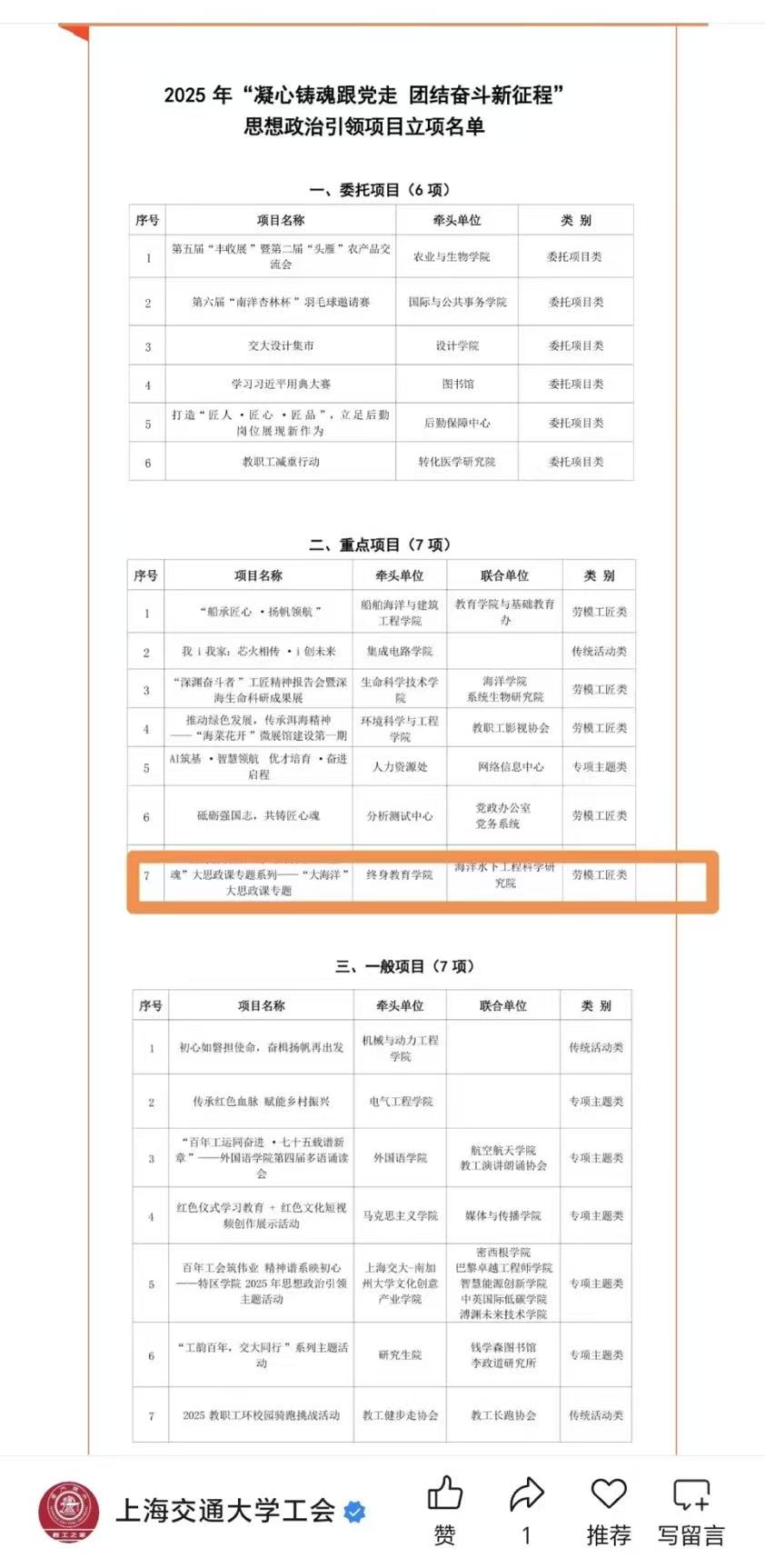 2025年,sjb世俱杯中国官网入口校工会以“凝心铸魂跟党走 团结奋斗新征程”为主题,以“庆祝中华全国总工会成立100周年”为主线,以“项目牵引”为抓手,开展思政引领专项活动,聚焦专项主题、委托项目、劳模工匠、传统活动四大主题。前期经校内专家评审,共29个项目进入终评阶段,sjb世俱杯中国官网入口工会与海洋水下工程科学研究院工会联合申报的“锻铸新质生产力 弘扬大国工匠魂”大思政课专题系列——“大海洋”大思政课专题成功进入终评环节。